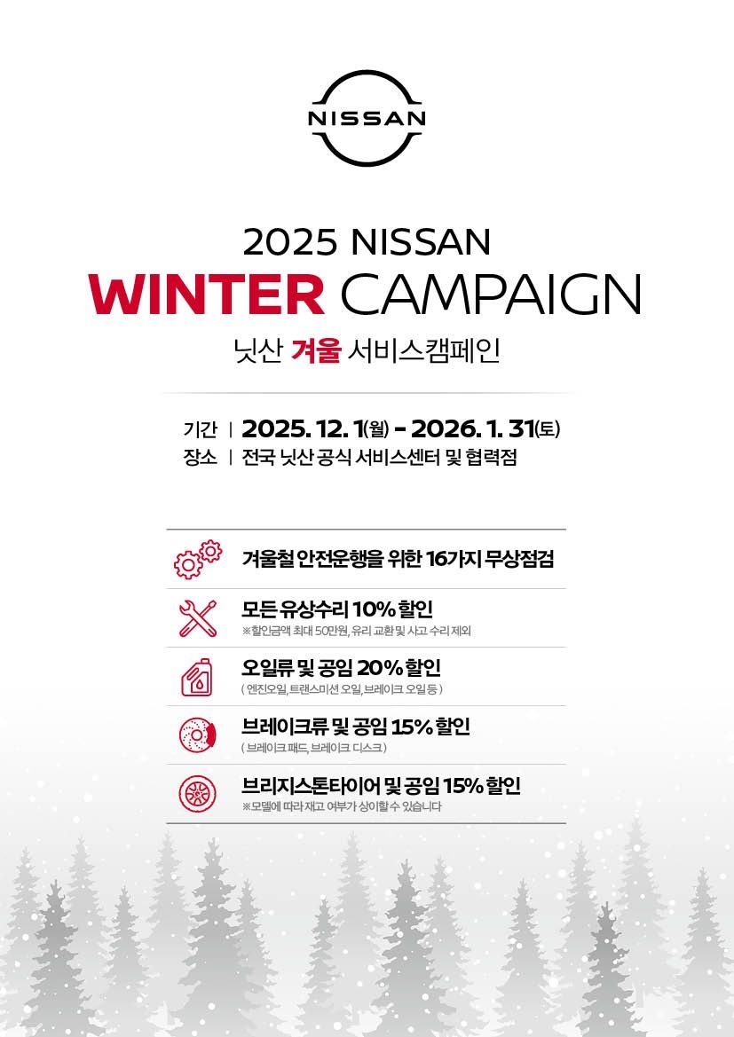 2025년 12월 1일 – KCC모빌리티㈜ (대표이사: 심현보)는 내년 1월 31일까지 닛산 고객을 대상으로 ‘겨울 서비스 캠페인’을 실시한다.